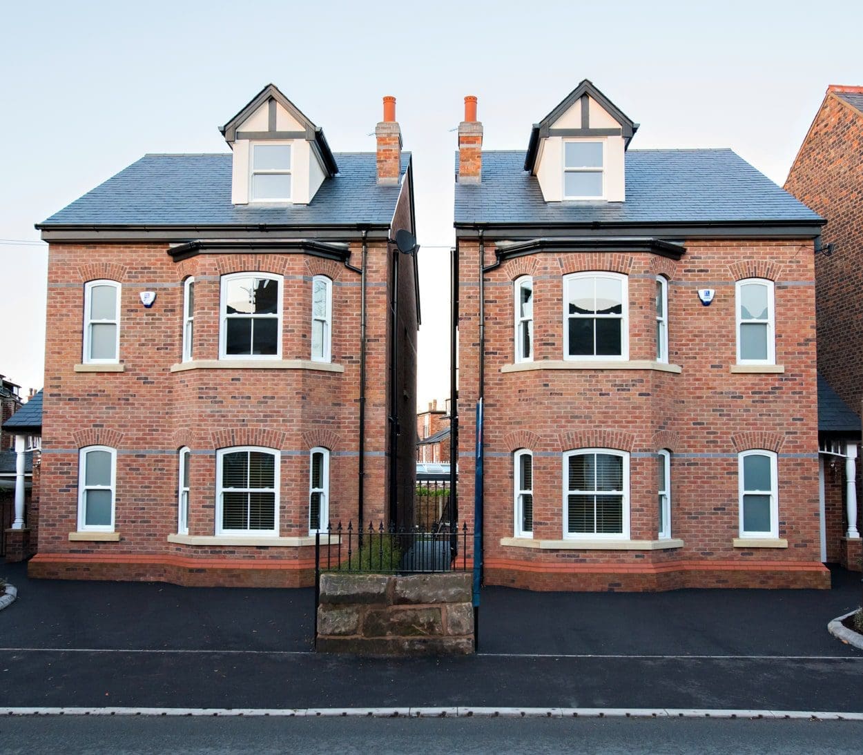 Planning was gained for a local developer to replace a single dwelling with two detached houses to suit modern family life. Off road parking was gained for two cars within the landscaped frontage by the clever use of a single storey entrance hall to the side of each house, providing both a safe focal point for the front door, and respectful separation distances to the neighbouring properties. Plus also a great hidden spot to store the bins.
