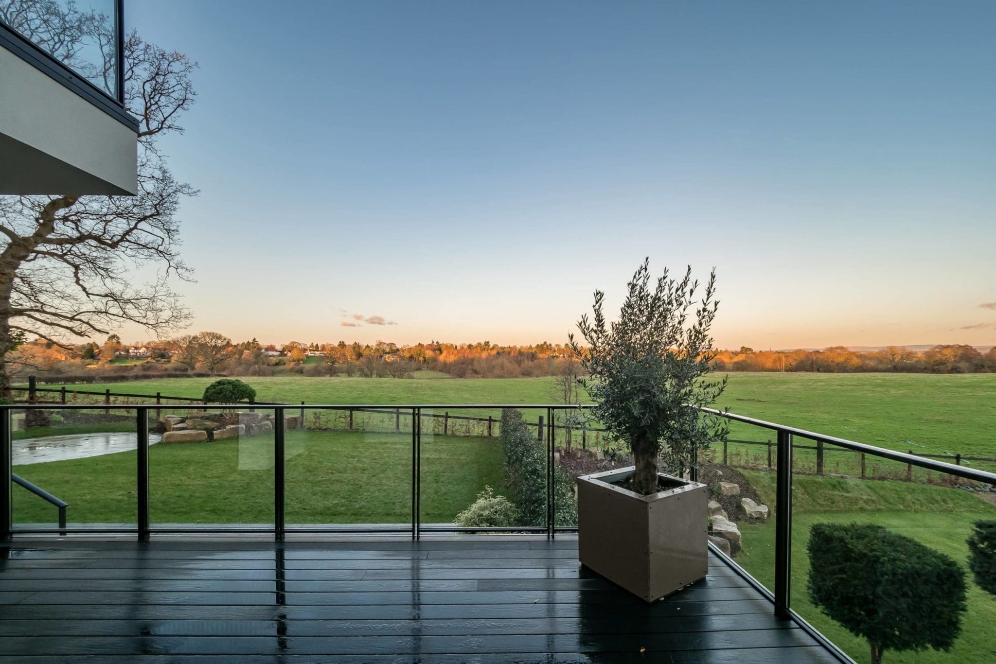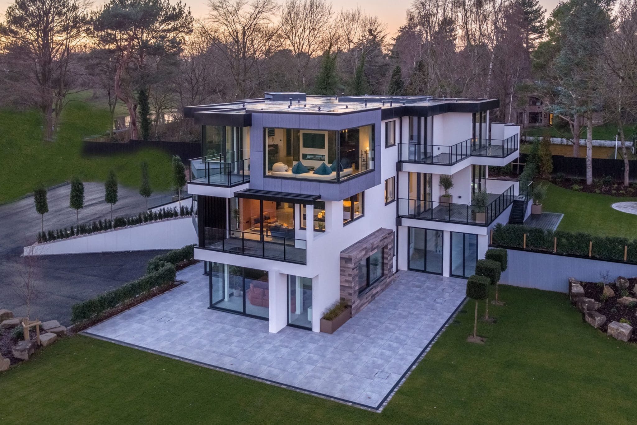 The stunning white rendered exterior and contemporary staggered cube design makes a real impact, utilising Brise Soleil to control solar gain and oriel windows to capture and frame the breath taking views.