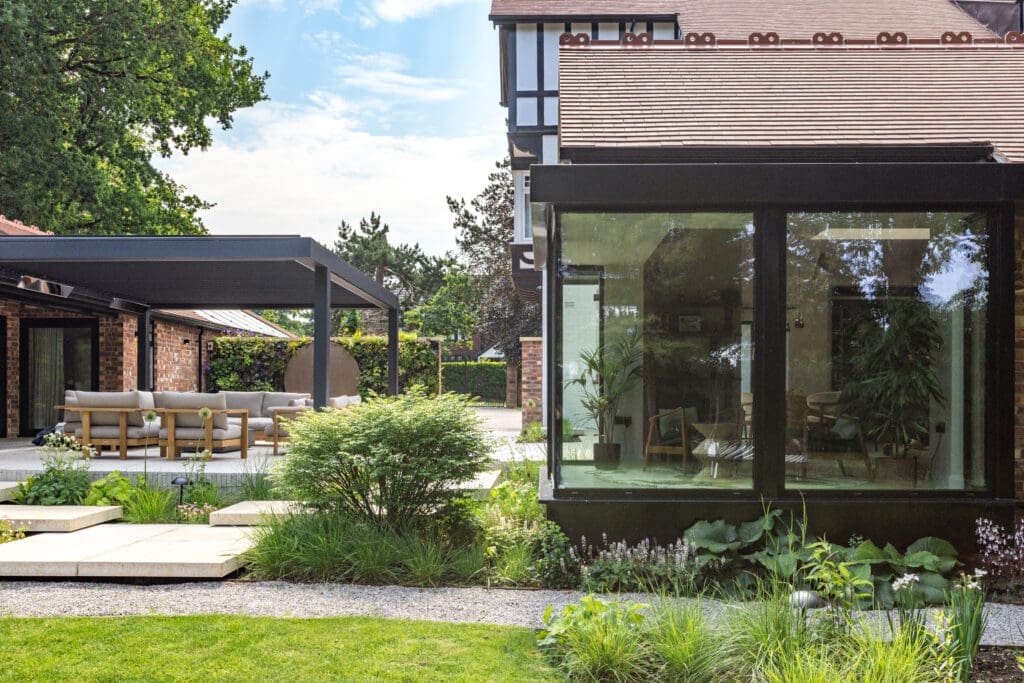 The detached garage was extended and converted into a self-contained annex with a media suite, discreet home office, and guest bedroom with bathroom.