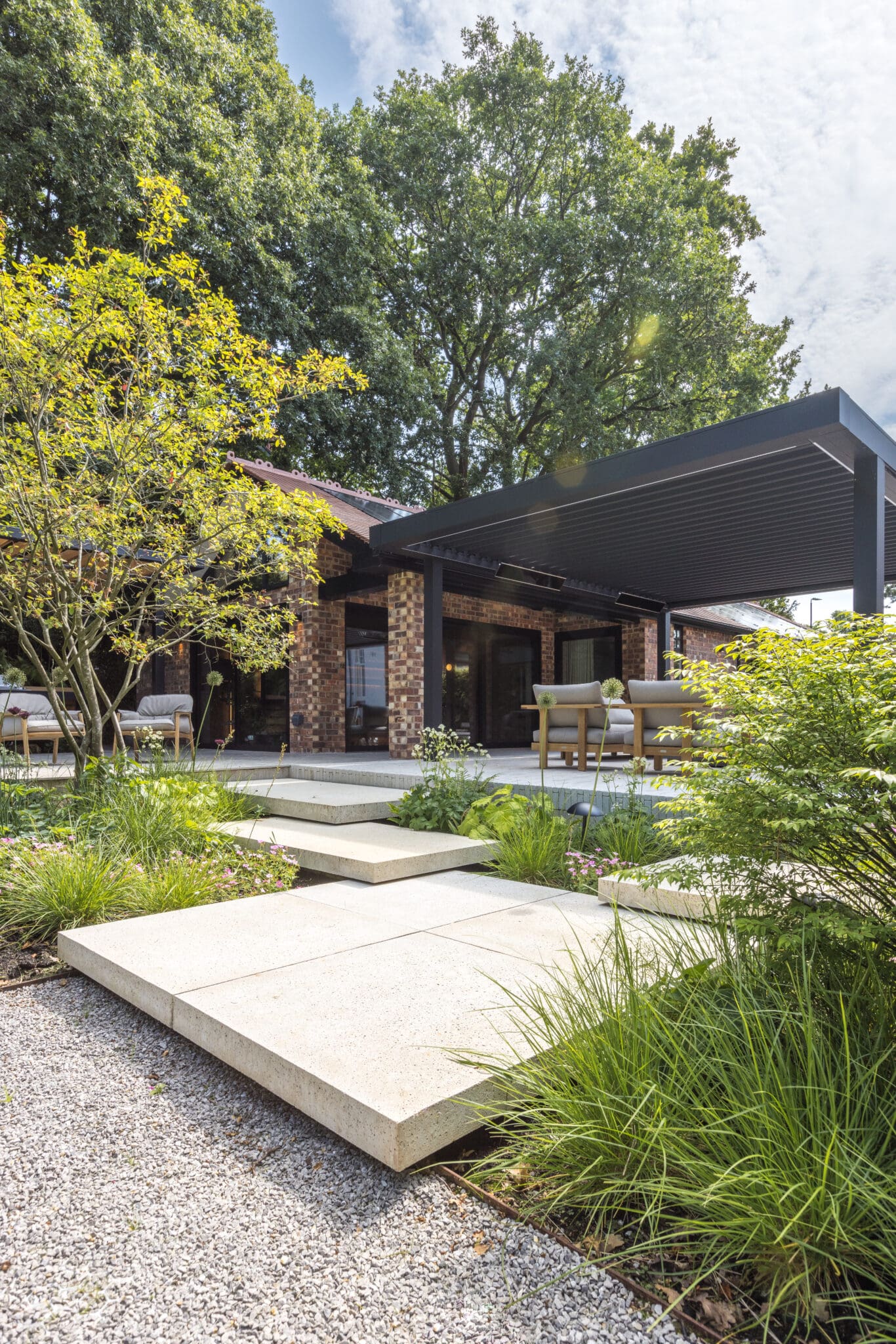 The goal was to enhance the kitchen area to establish a central family hub, extend the garage to accommodate a media suite and guest quarters, and seamlessly connect these new spaces with a secluded, hard-landscaped garden — ultimately crafting a tranquil retreat that unifies all elements of the home.