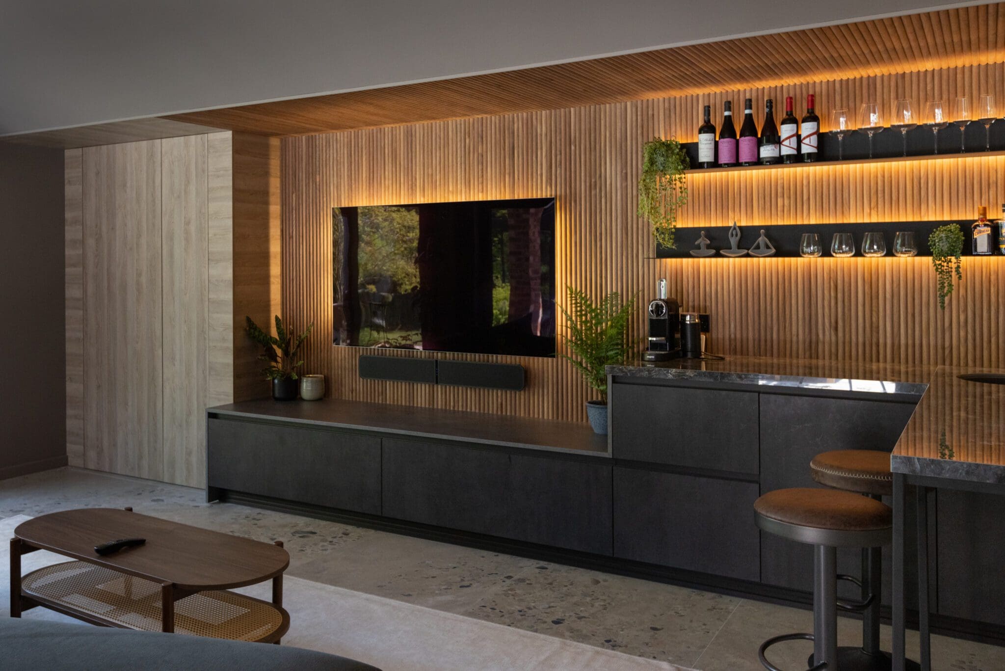 The detached garage was extended and converted into a self-contained annex with a media suite, discreet home office, and guest bedroom with bathroom.