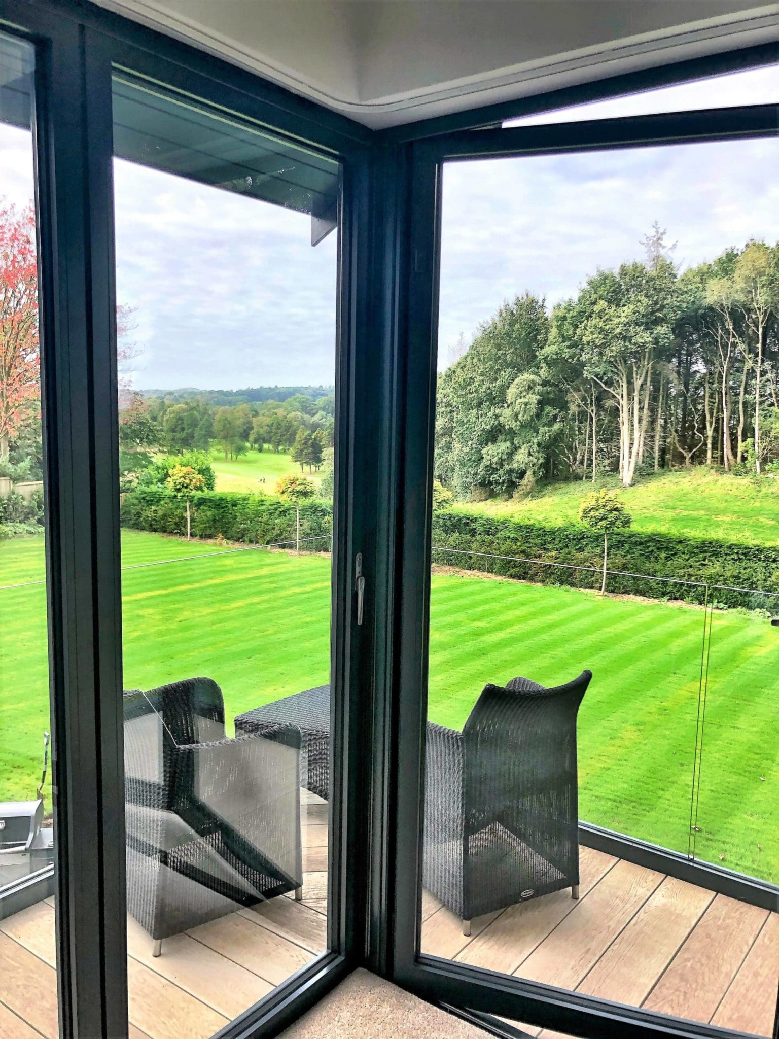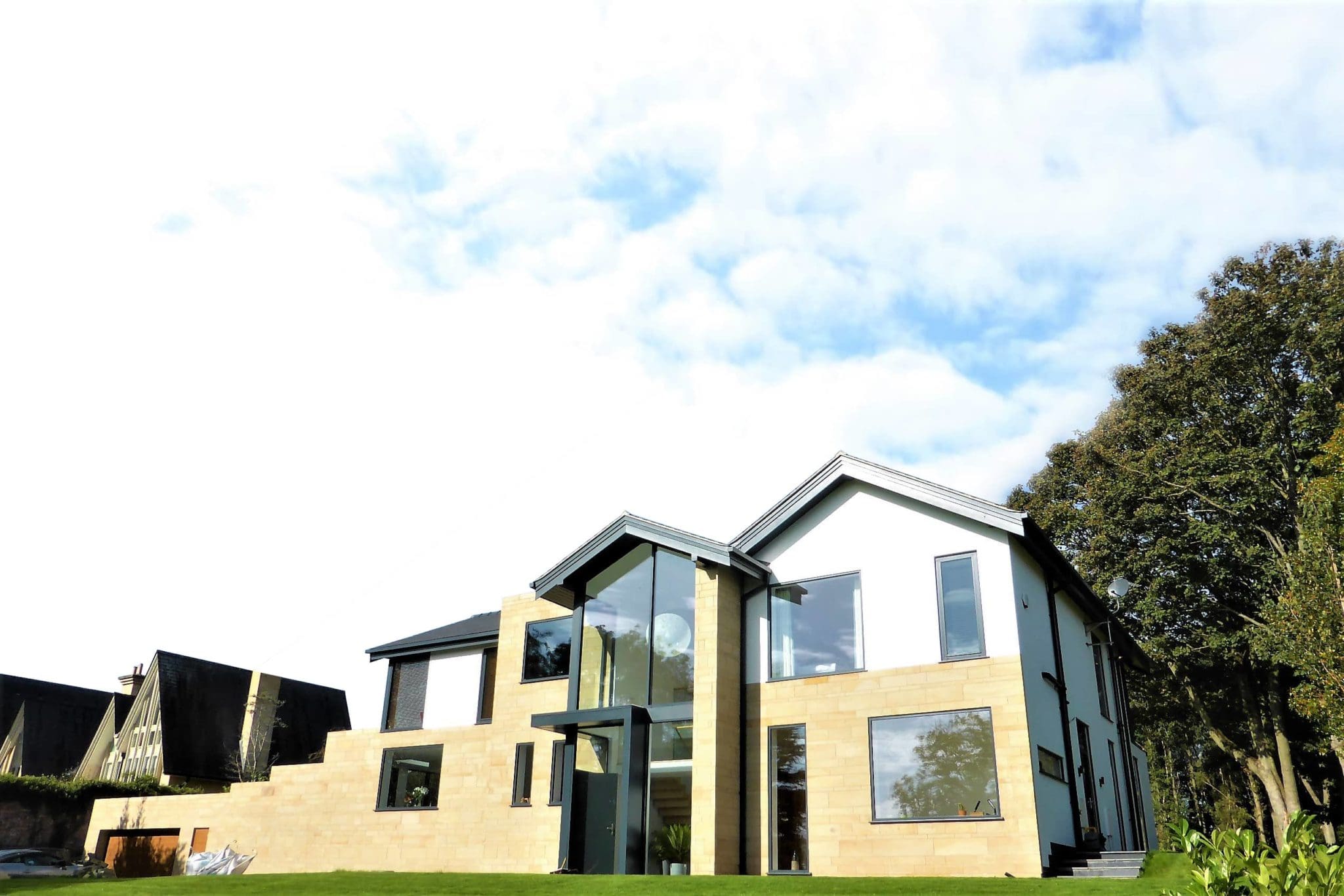 In an elevated position overlooking a golf course to the west and the Derbyshire hills to the east, the house was designed predominantly for the views. Each room has enormous windows framing vistas of the hills or fairways. Despite the amount of glass, the orientation, high-efficiency heating and insulation used resulted in one of the highest ratings of 86 B for thermal efficiency.