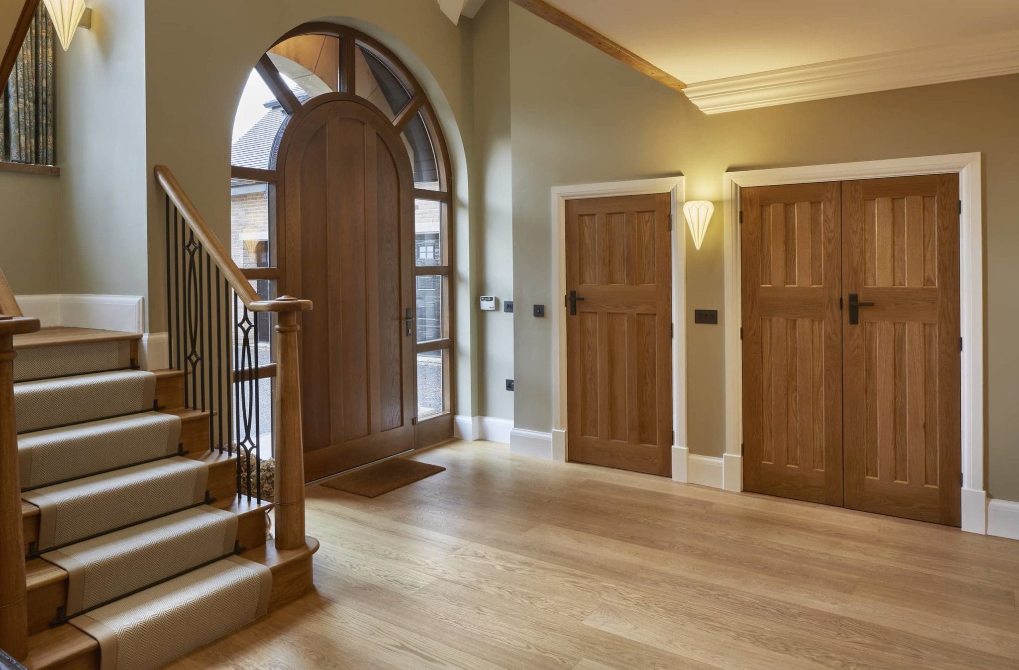 The oversized 9ft entrance door by Illingworth Ingham is a beautiful piece of local craftsmanship and is also a sign of the high quality of materials and workmanship throughout, with a bespoke staircase and beautiful solid oak flooring by Havwoods which was featured as one of their case studies