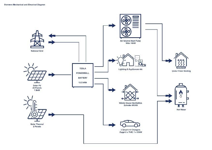 This Arts and Craft style property was designed with a 21st century focus on renewable and low carbon energy. Sustainability and efficiency were prominent in the design brief, and this was achieved with the installation of an air source heat pump and solar thermal, a heat recovery system, renewable power and storage, plus electric vehicle charging points.
