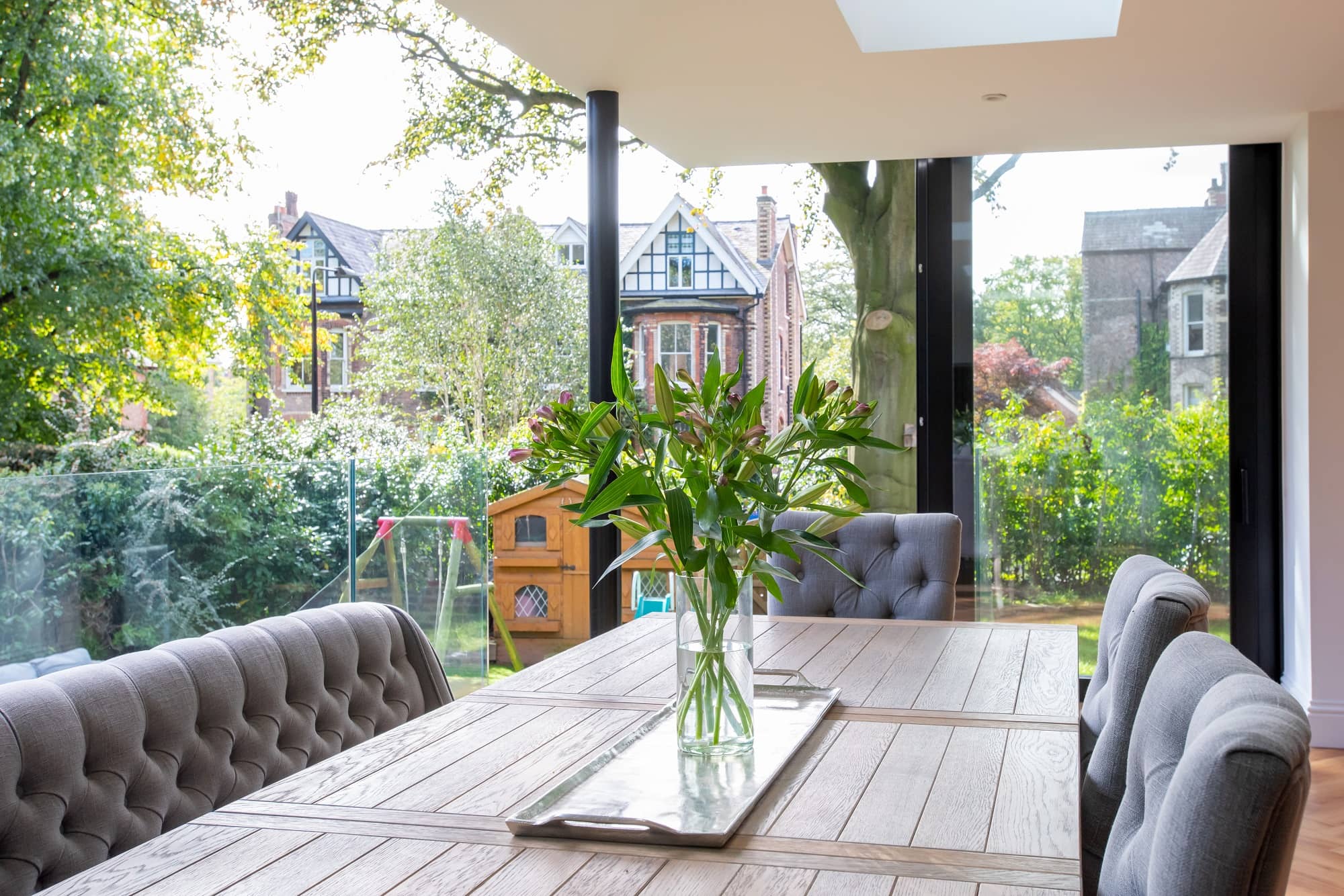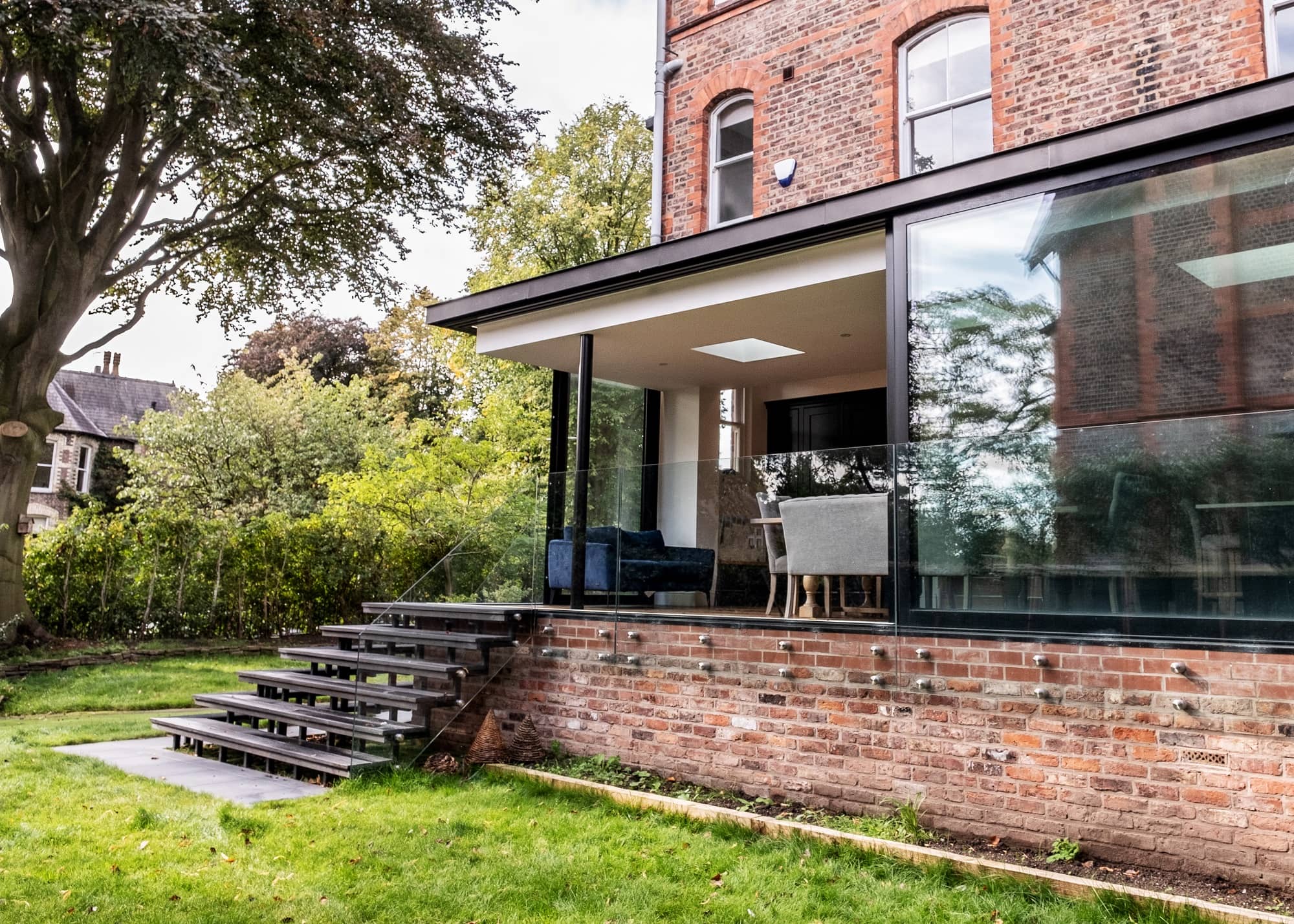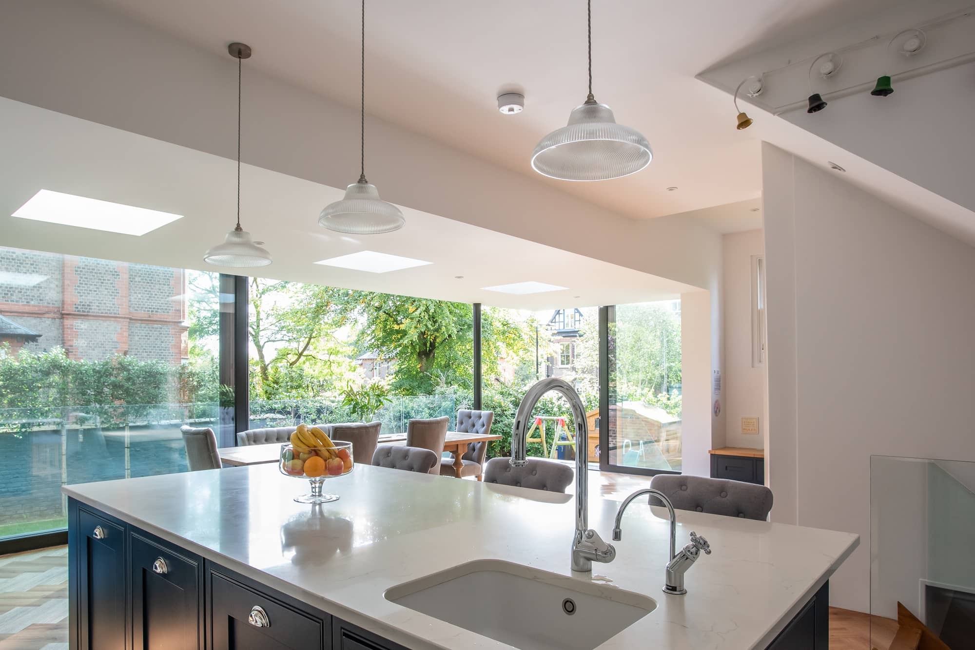 This contemporary glass extension was designed to maximize light into the open plan kitchen/living area with clever engineering. The design sees a minimal soffit height to maximise the effect of the full height glass and floating corner, giving a real sense of bringing the outdoors in.