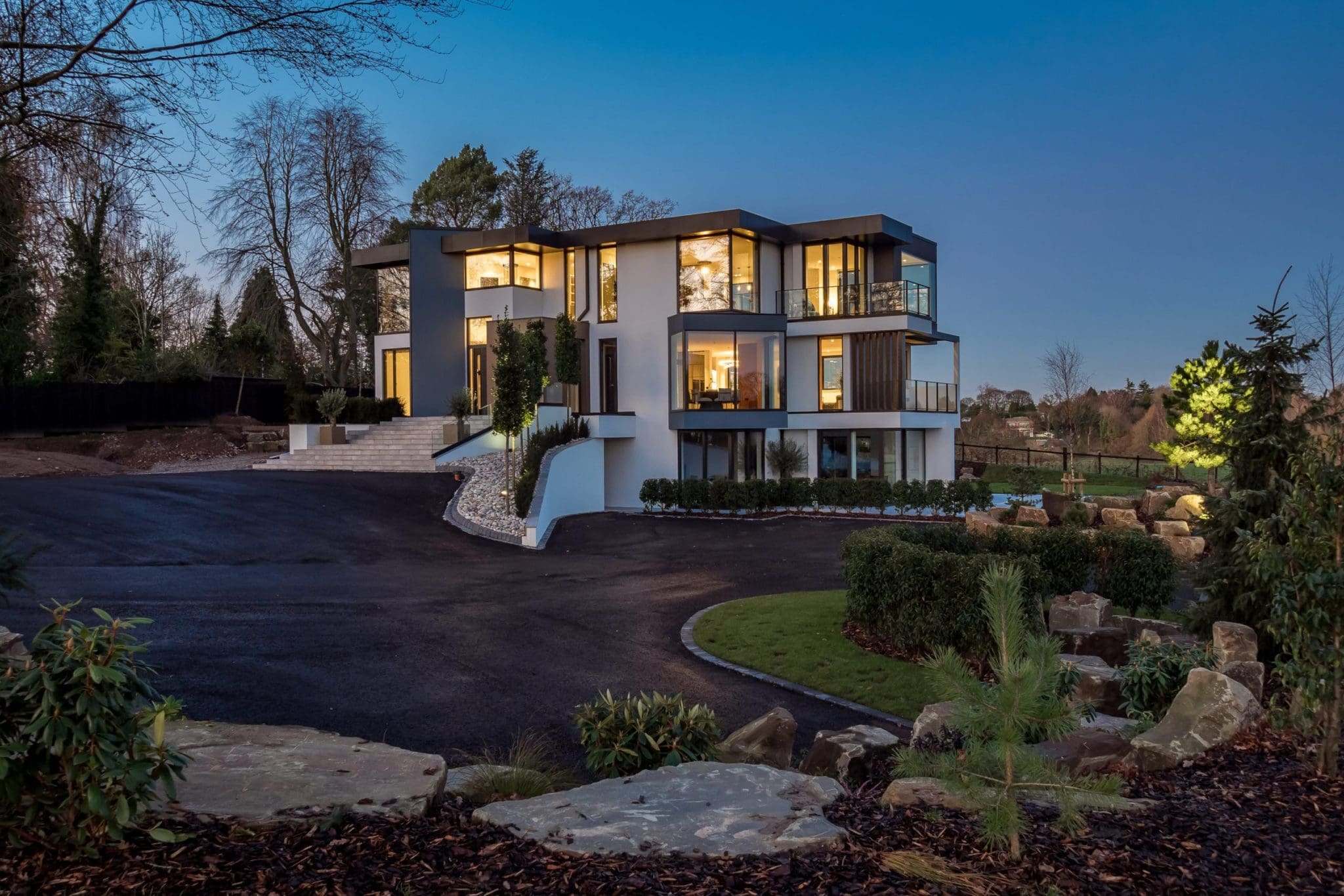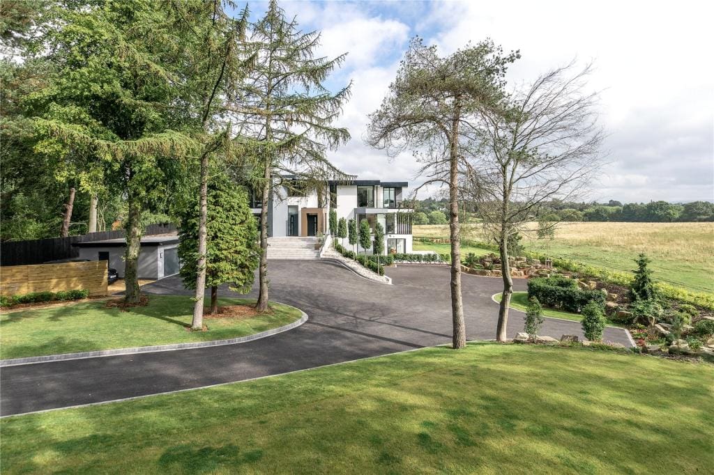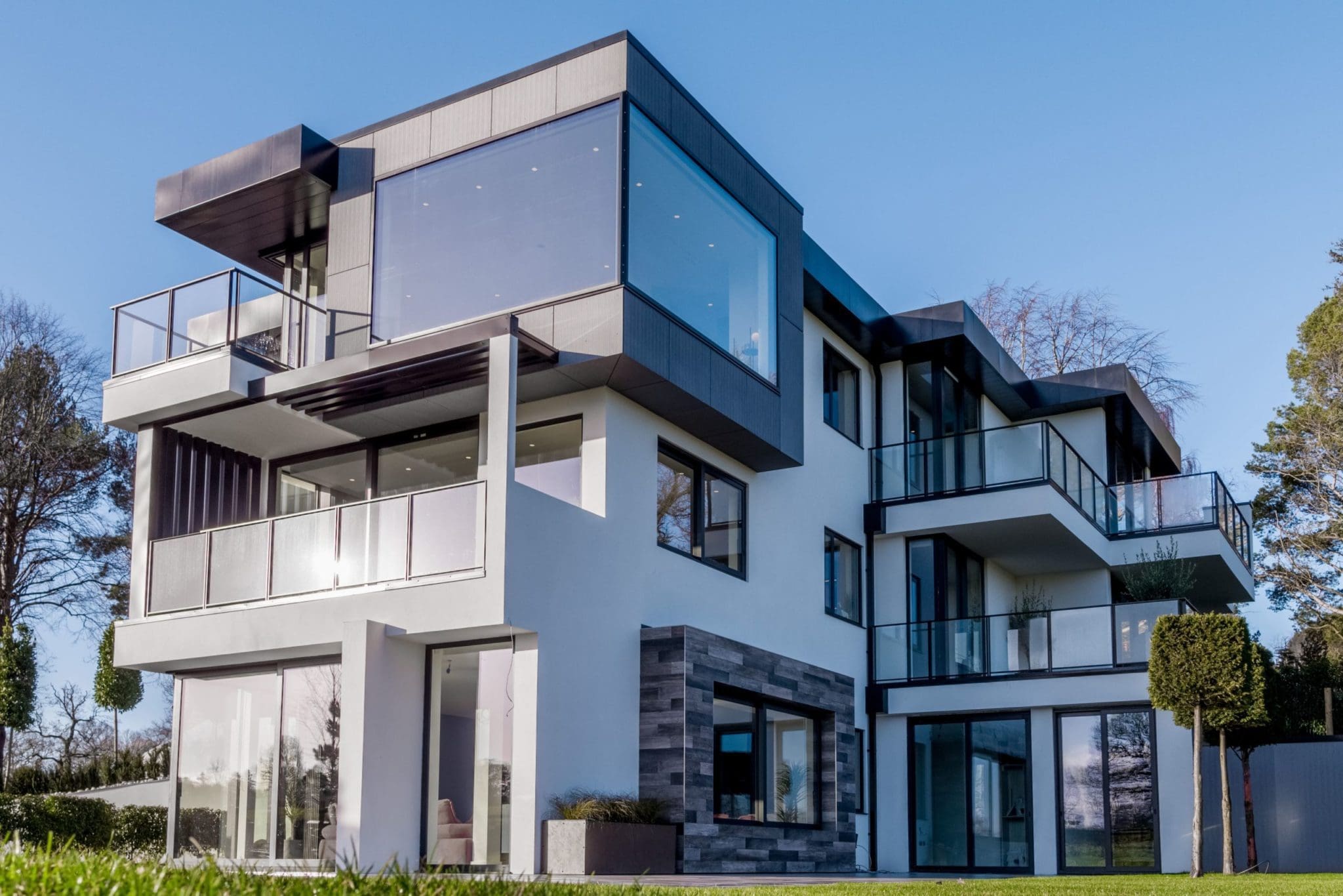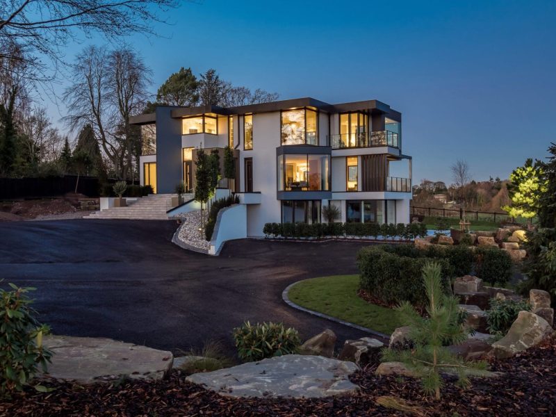 The stunning white rendered exterior and contemporary staggered cube design makes a real impact, utilising Brise Soleil to control solar gain and oriel windows to capture and frame the breath taking views.