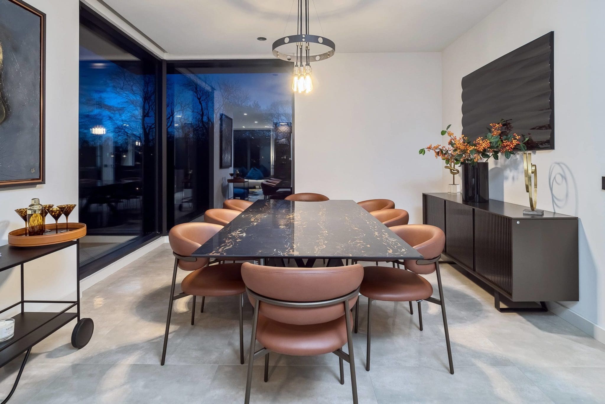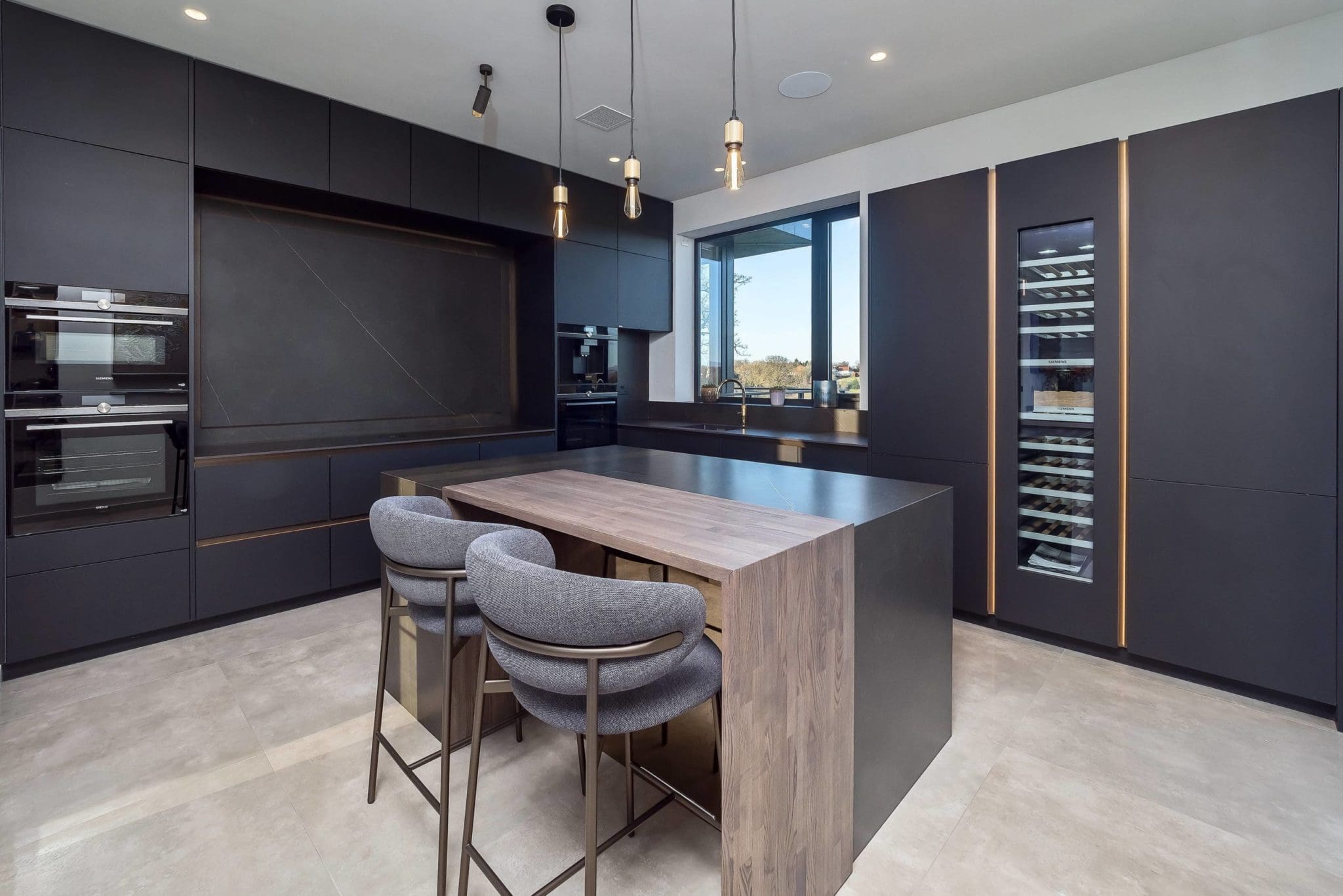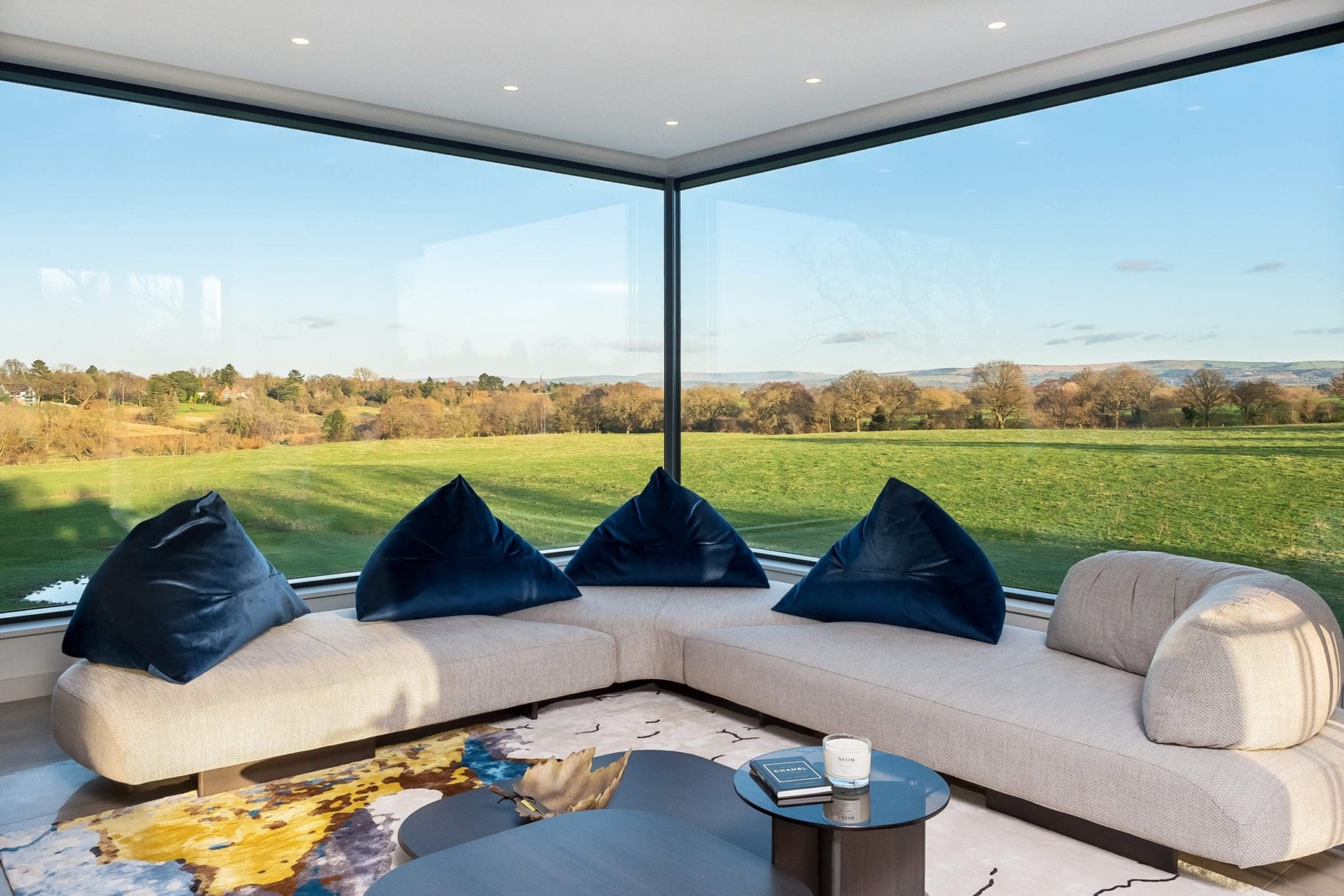 The stunning white rendered exterior and contemporary staggered cube design makes a real impact, utilising Brise Soleil to control solar gain and oriel windows to capture and frame the breath taking views.