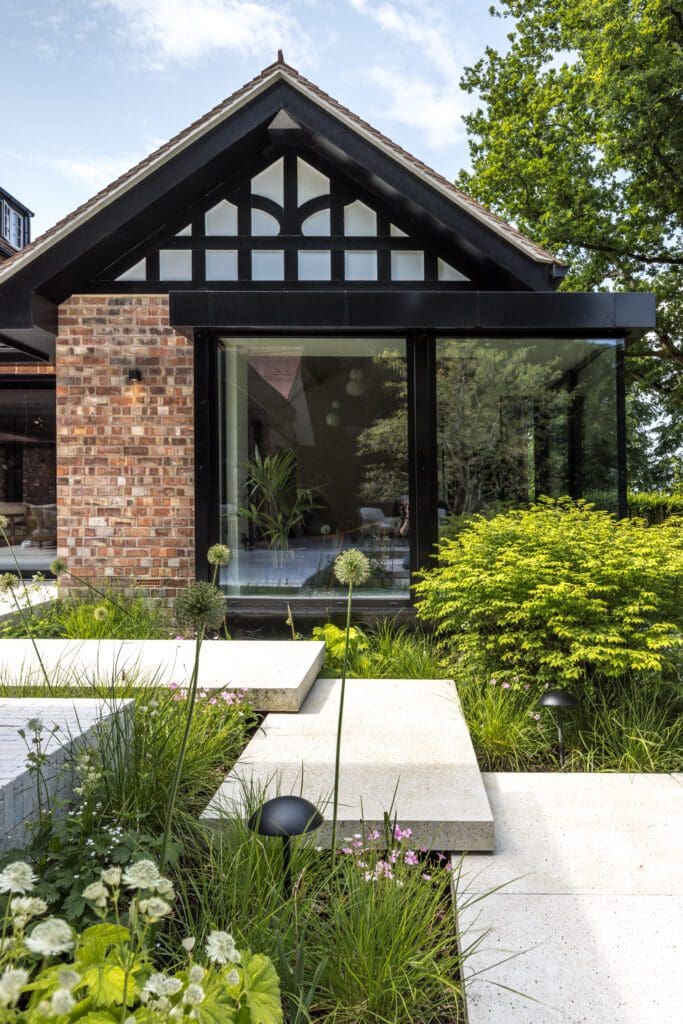 The detached garage was extended and converted into a self-contained annex with a media suite, discreet home office, and guest bedroom with bathroom.