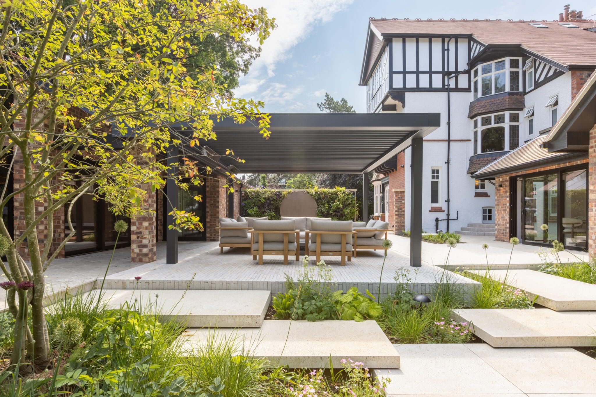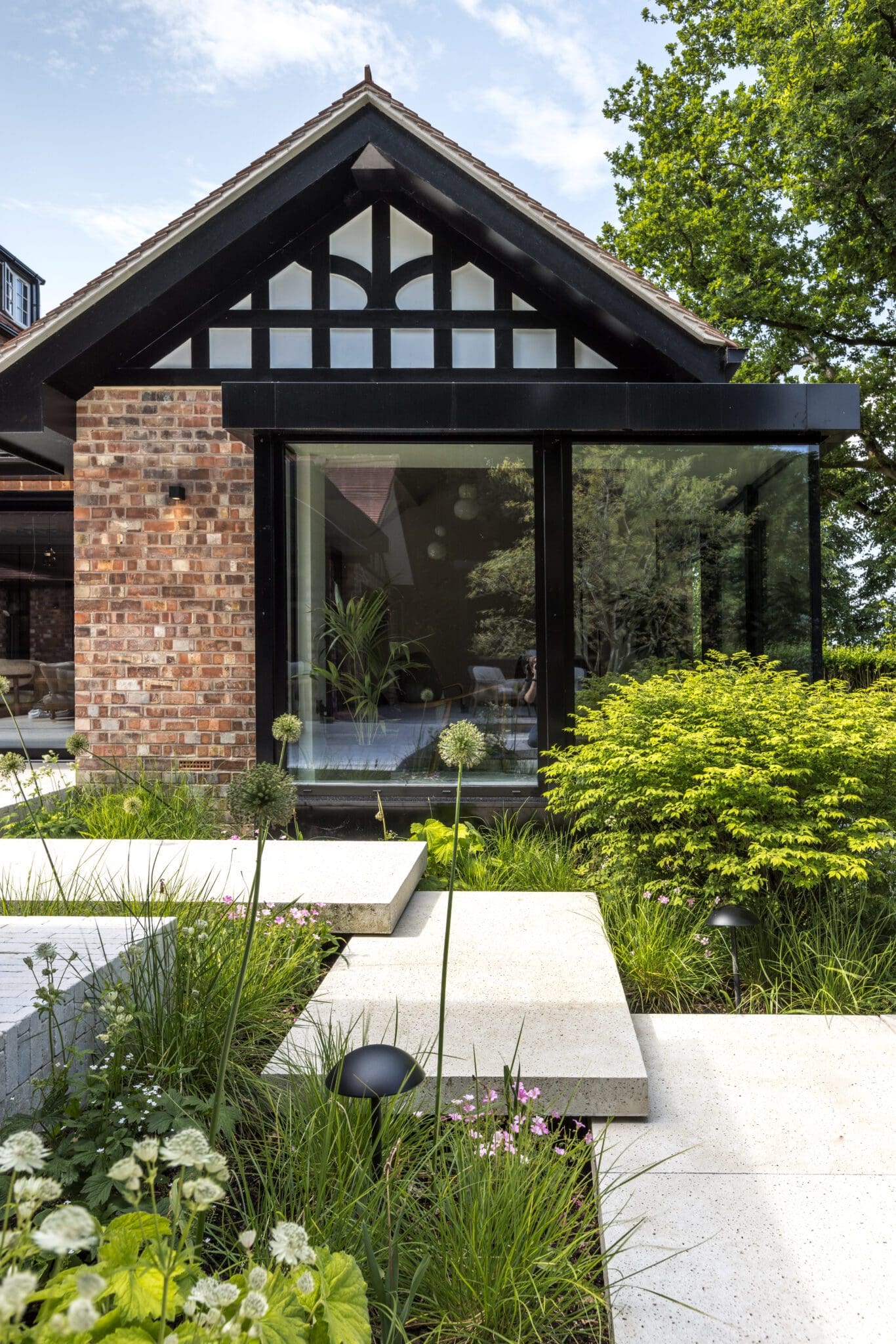 The detached garage was extended and converted into a self-contained annex with a media suite, discreet home office, and guest bedroom with bathroom.