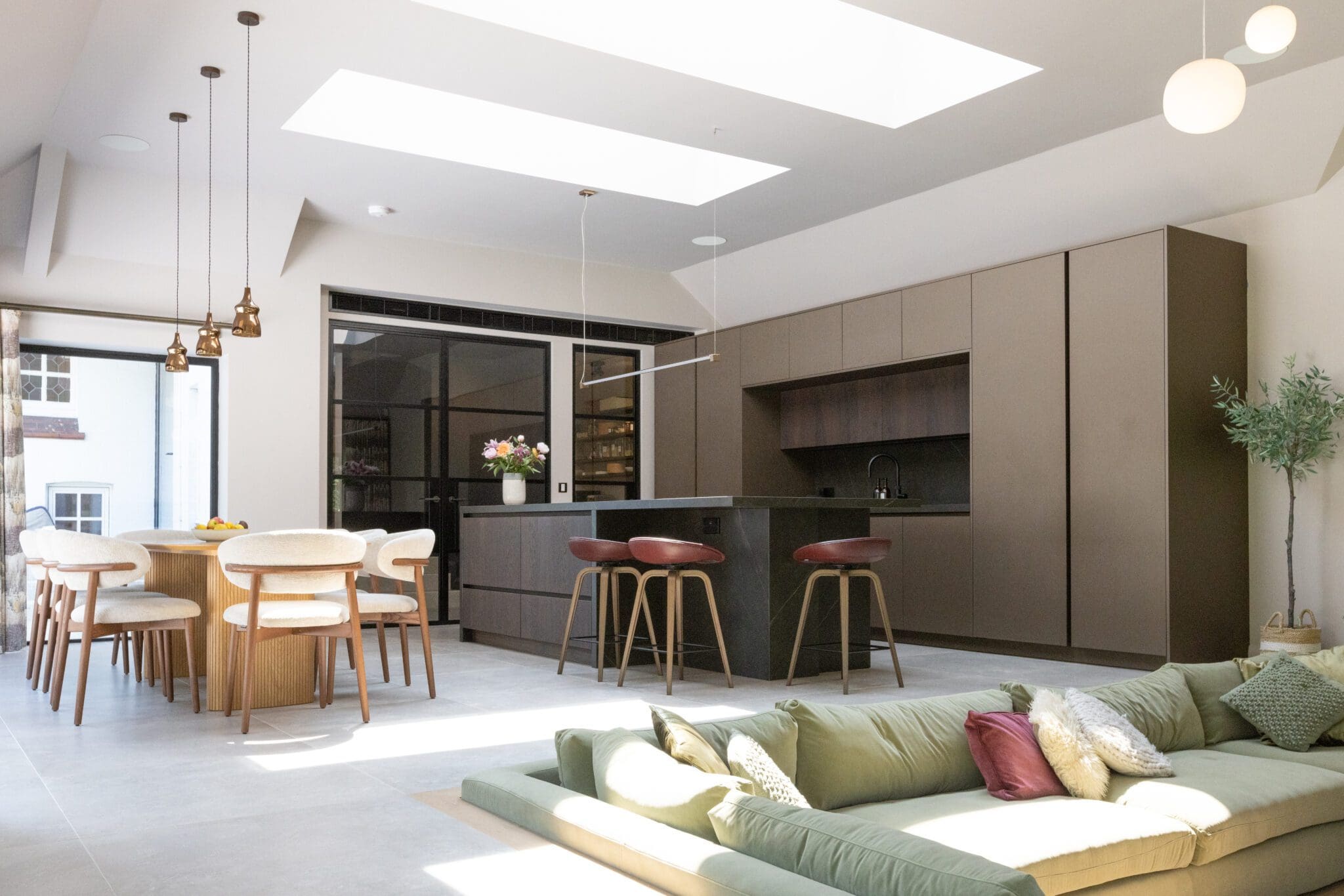 A generous rear extension was constructed to house a new open-plan kitchen, dining area, and sunken seating space, all designed to maximise natural light and provide uninterrupted views and direct access to the garden.