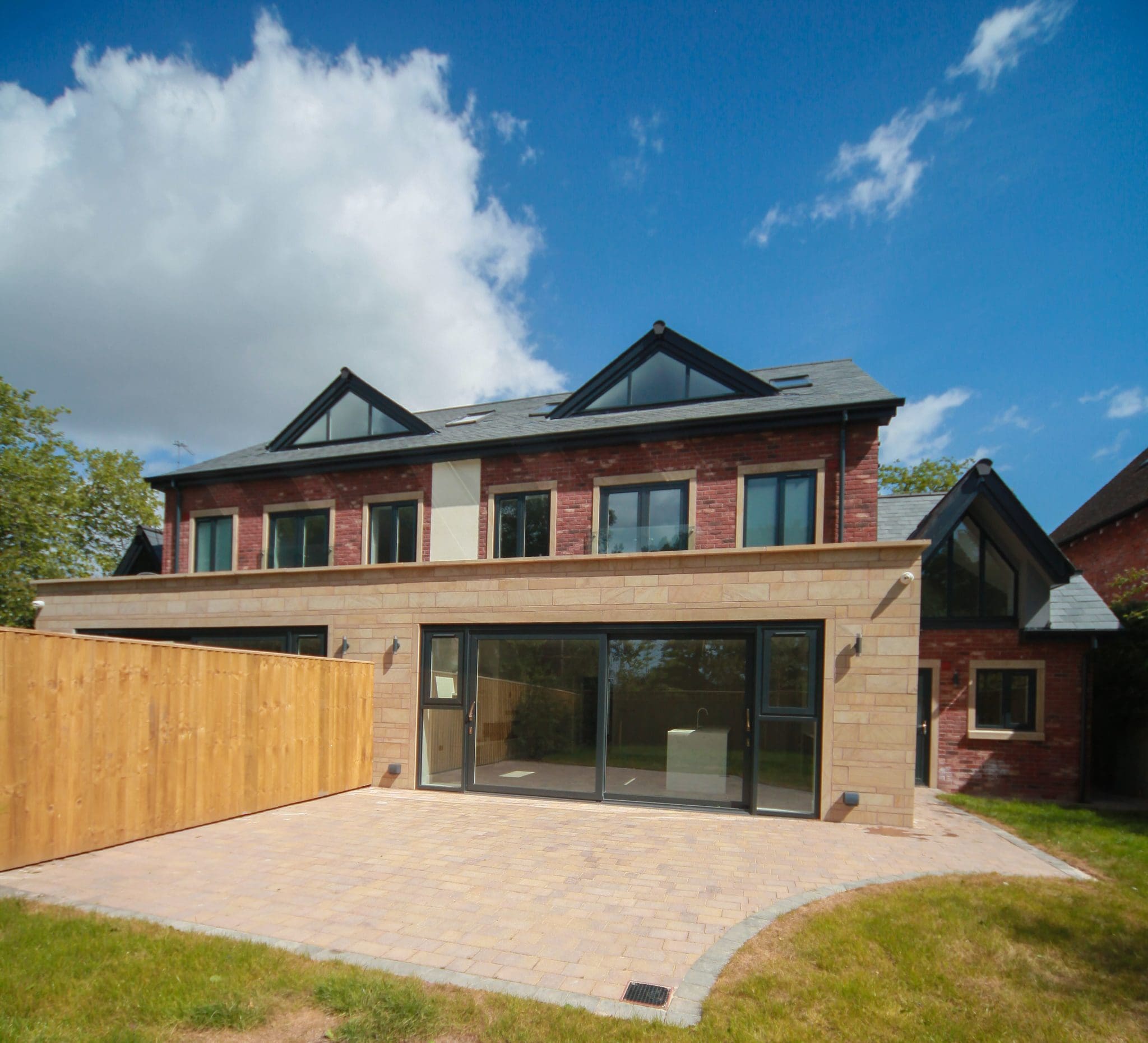 Hale Barns has an eclectic mix of homes, period details and exterior materials which allowed for the use of quality stonework, render and brickwork to differentiate the two houses and enhance the street scene.