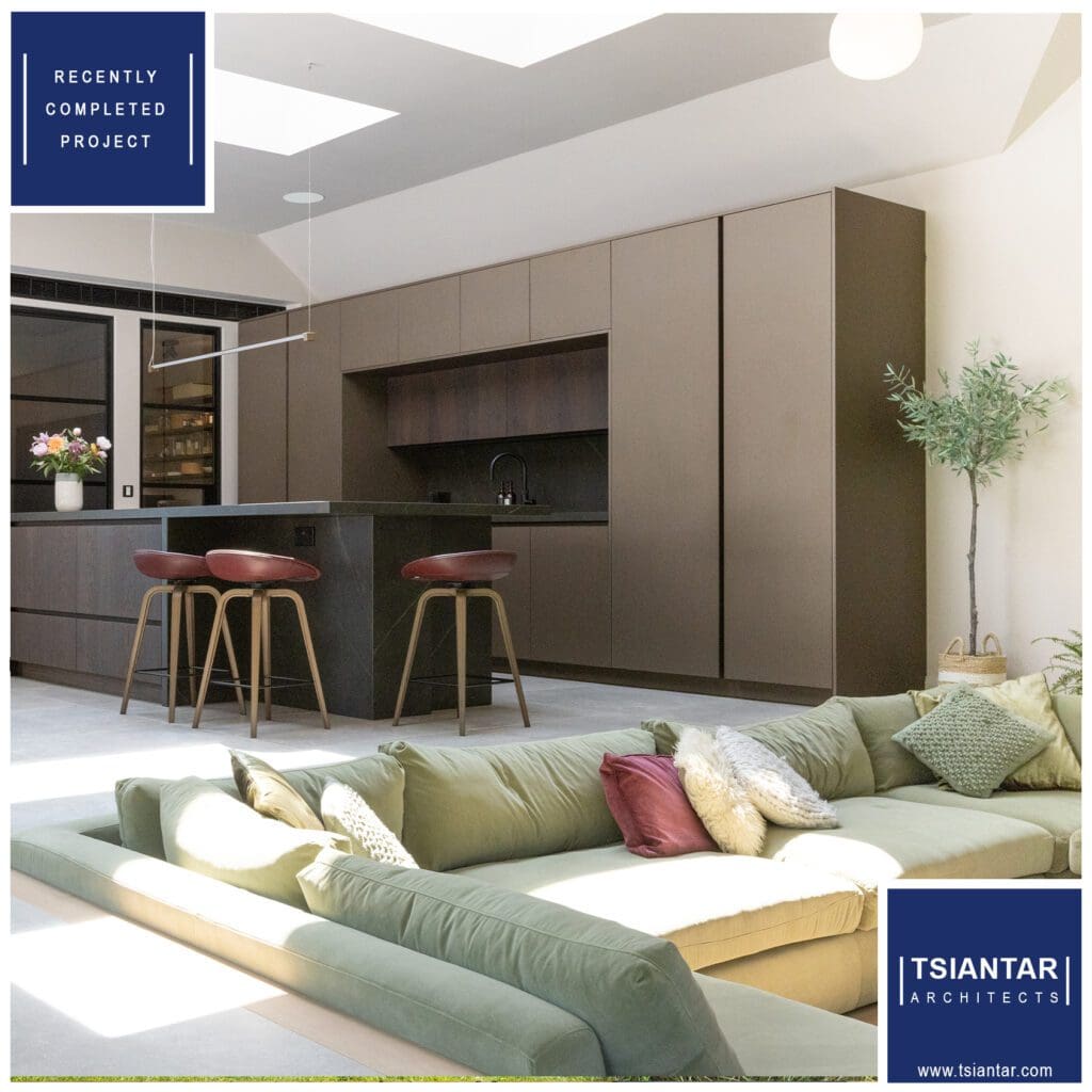 The brief for this project was to create a single-storey rear extension and a basement conversion that would reconfigure the existing layout into a more cohesive and functional living environment. The goal was to enhance the kitchen area to establish a central family hub, extend the garage to accommodate a media suite and guest quarters, and seamlessly connect these new spaces with a secluded, hard-landscaped garden — ultimately crafting a tranquil retreat that unifies all elements of the home.