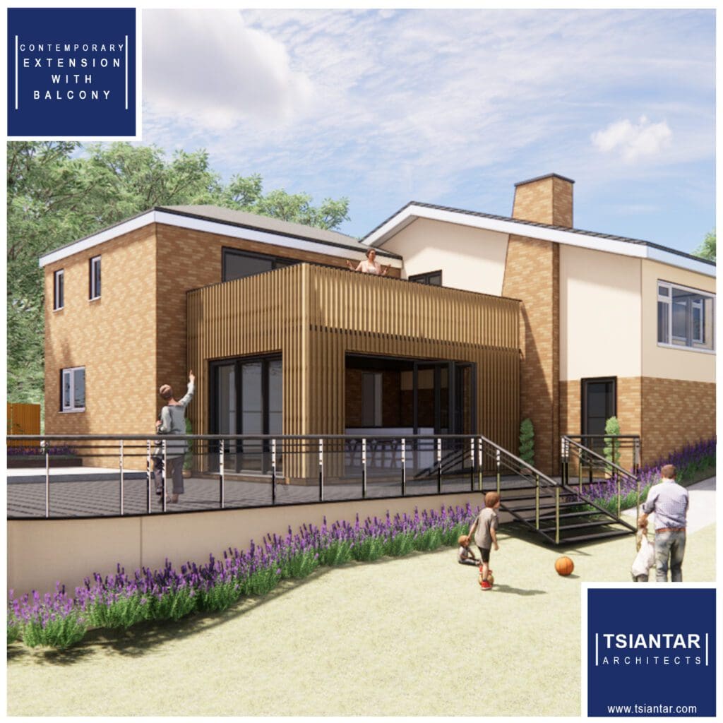 Clever design and using the sloping site, a contemporary single storey rear extension is being added to house an entertainment suite with large glazing elements and dual access into the garden at the lower ground floor level. Above this will be a balcony off the existing first floor kitchen discreetly masked by the continuous timber balustrade and providing the perfect spot to relax and enjoy the panoramic views from this property.