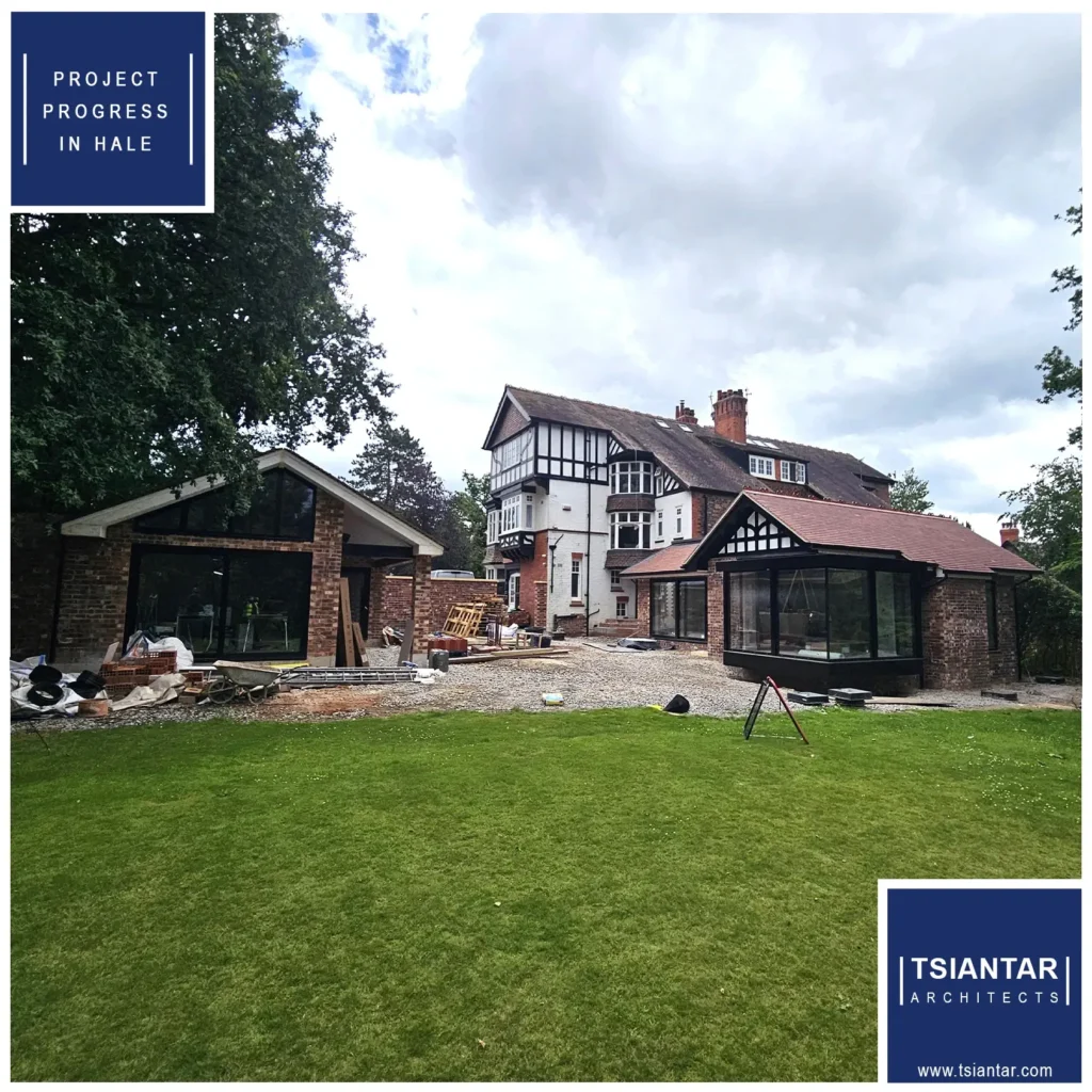 Not far off completion, our dual extension and refurbishment project in Hale comprises of a large extension at the rear of the property to create a new kitchen, dining, and sunken seating area. This fabulous new space optimises both the light and the views, and the floating window adds a stunning feature merging the line between the outside and the inside.