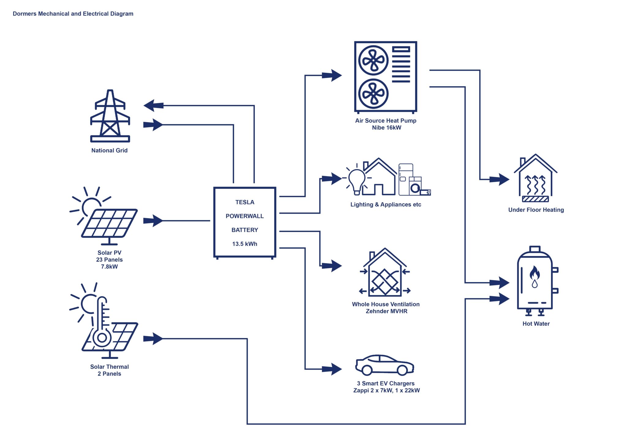 This Arts and Craft style property was designed with a 21st century focus on renewable and low carbon energy. Sustainability and efficiency were prominent in the design brief, and this was achieved with the installation of an air source heat pump and solar thermal, a heat recovery system, renewable power and storage, plus electric vehicle charging points.